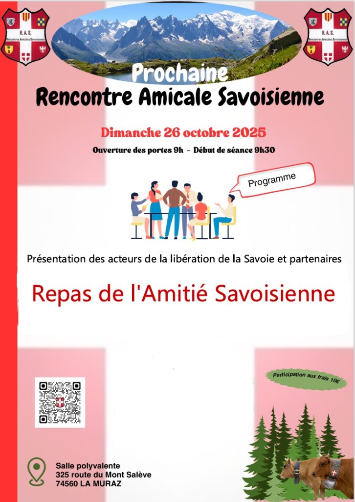 Nous aurons le plaisir de nous retrouver dimanche 26 octobre à partir de 9h. De nombreux invités parmi les acteurs de la Savoie Libre seront présents ainsi que nos partenaires. Après la présentation des divers mouvements et partenaires, nous nous retrouverons cordialement autour d’un repas festif.